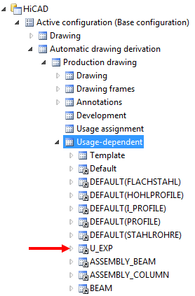 The list of the usages in the Configuration Editor at Automatic drawing derivation > Production drawing > Usage assignment can be expanded by new assignments. In particular, you can define your own usage-dependent settings.