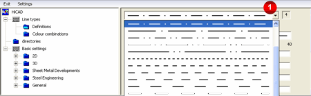 You can change the line types in the Definitions sub-folder. Line types define how lines and edges are displayed, e.g. solid, dashed, dot and dash etc. Nine different line types are predefined in HiCAD and can be changed here - with the exception of line types 1 to 4.