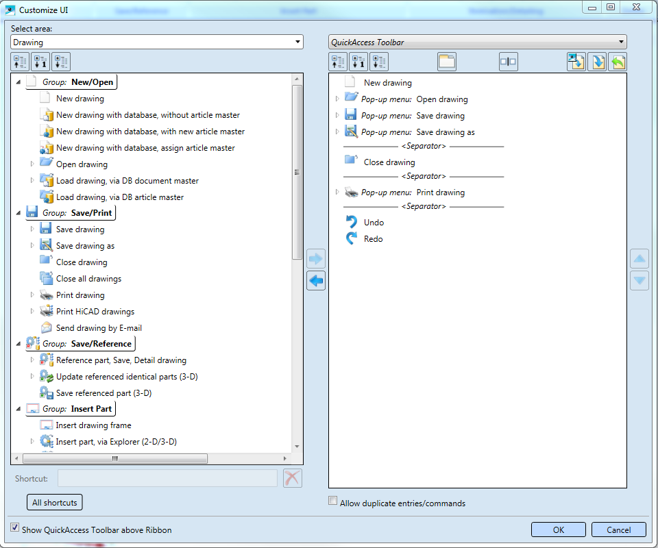 Add >> Adds the marked entry of a HiCAD Ribbon to the current, user-defined Ribbon tab. Please note: If the selected entry already exists in the user-specific Ribbon tab while the Allow duplicate entries/commands checkbox is deactivated, the Add >> function will be locked! |