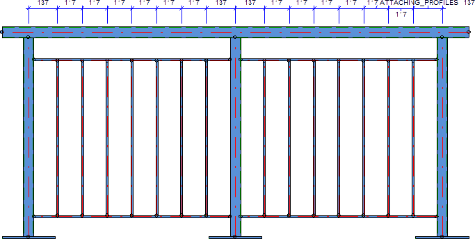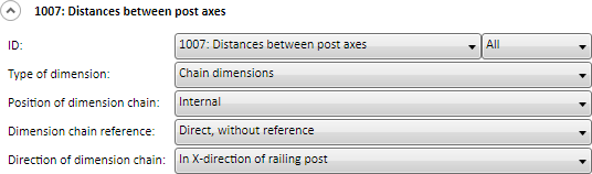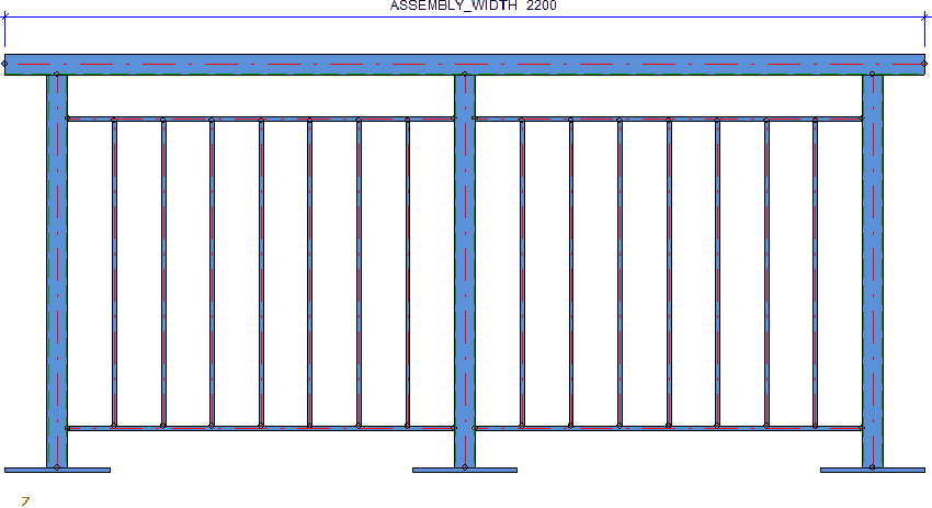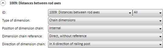 Distances between rod axes This rule dimensions the axis distance between posts and vertical rods as chain of dimensions. The dimensioning takes place in all fields of the railing segment. If the dimensions of the rule are not equal in all fields, only the dimension of the first field will be created.