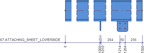 When dimensioning attached sheet/plate parts or plates and beams that border on dimensionally relevant beams, both contact points will always be dimensioned. If only the first contact point in the chain is to be dimensioned, open the STW_DimSettings.XML (conventional dimensioning settings) file in the HiCAD sys directory and set the parameter