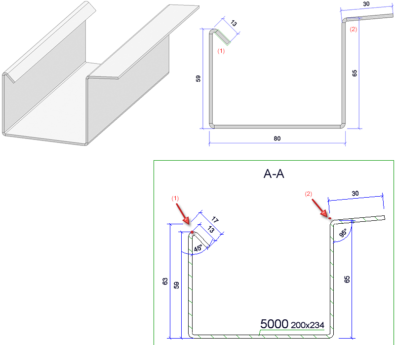 Please note: When dimensioning the flange length of sheets in sectional views, the following base point is being dimensioned: