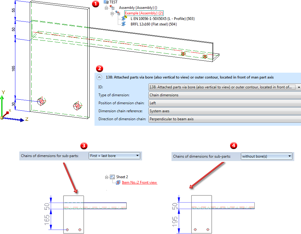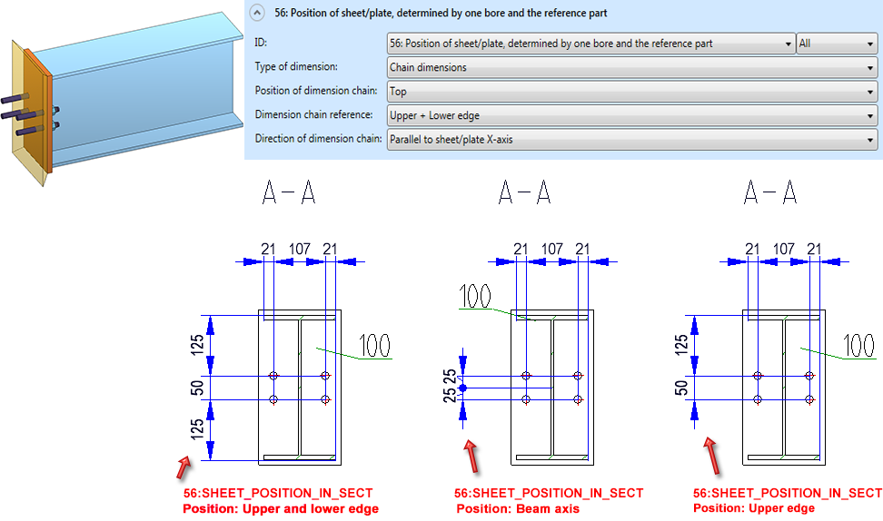 ATTACHING_SHEETS_SEPERATELY Via bores, if they are dimensioned perpendicular to screen plane and bores of sub-parts are dimensioned, or via outer contour; this is the only beam-related rule for which the direction VERTIKALSHEETAXIS is allowed in connection with the position INSIDE, in order to, e.g. dimension front plates on cuts in sheet/late direction! |