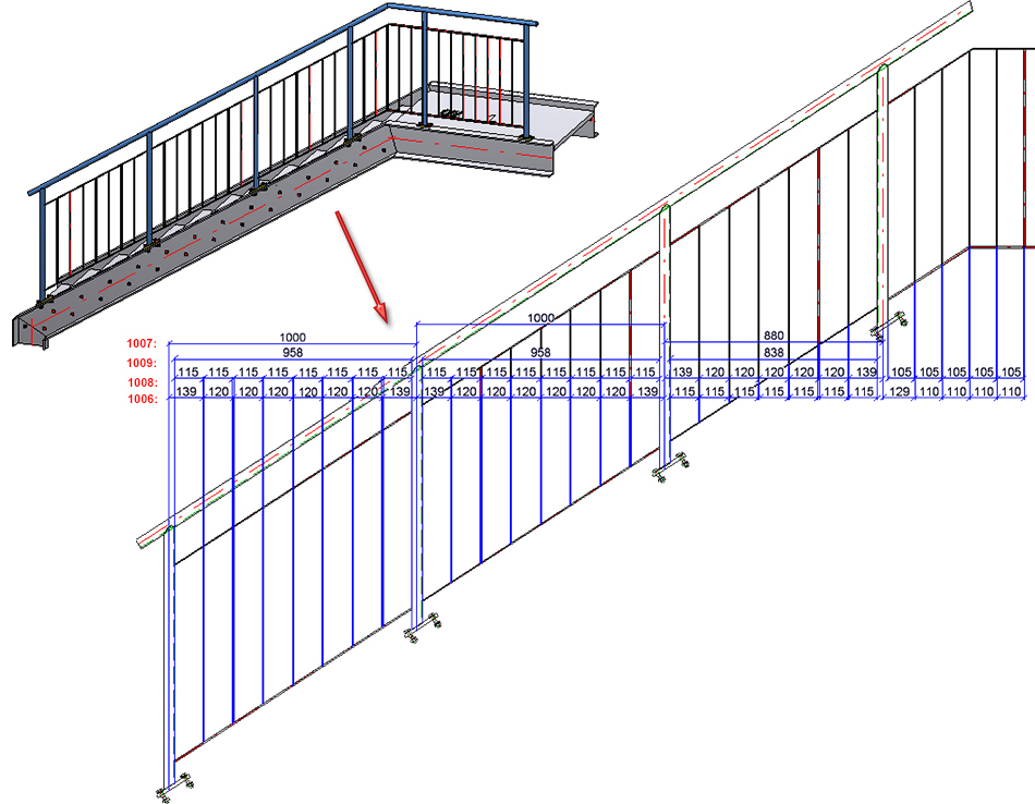 The oblique segment of the depicted staircase has individual distances for posts and vertical rods as well as different post and vertical rod thickness. Hence, dimension and chain of dimensions of rules 1006 to 1009 are not equal.