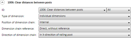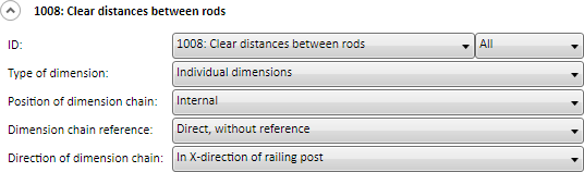 Clear distances between rods If the clear distance between two posts is dimensioned as Individual dimension, the post thickness will not be considered. The dimensioning takes places in all fields of the railing segments. If the dimensions of the rule are not equal in all fields, only the dimension of the first field will be depicted. Recommended setting for rule 1008