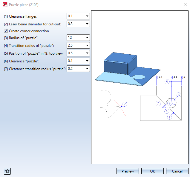 If you select Preview, the puzzle piece will be applied, but the dialogue window will remain open, enabling you to change parameters and check the result in the drawing if required. If you select OK, the puzzle piece will be applied, and the dialogue window will be closed. If you select Cancel, the window will be closed, but no changes will be applied.