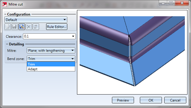 Mitre cut: Plane, with lengthening Bend zone: trimmed |