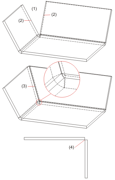 The Close corner, drainage area mode closes open corners that are created when adding flanges to sheets. The bend zone and milling edge zone will also be closed in the process.