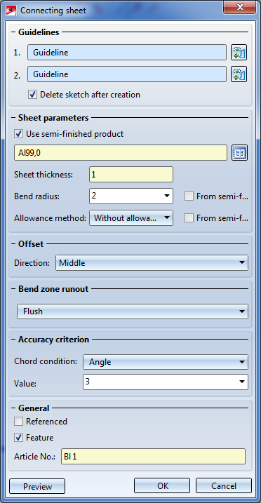 The arcs of the composite edges (guidelines) will be approximated synchronously by polygon courses, so that two lines each lie in one plane, thus defining a flange. The accuracy of the resulting sheet flanges can be defined in the Accuracy criterion area.