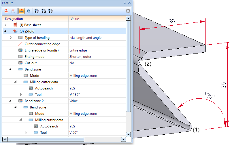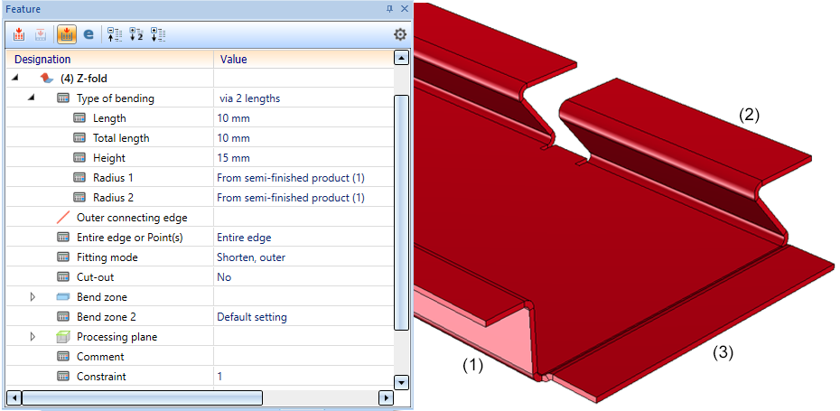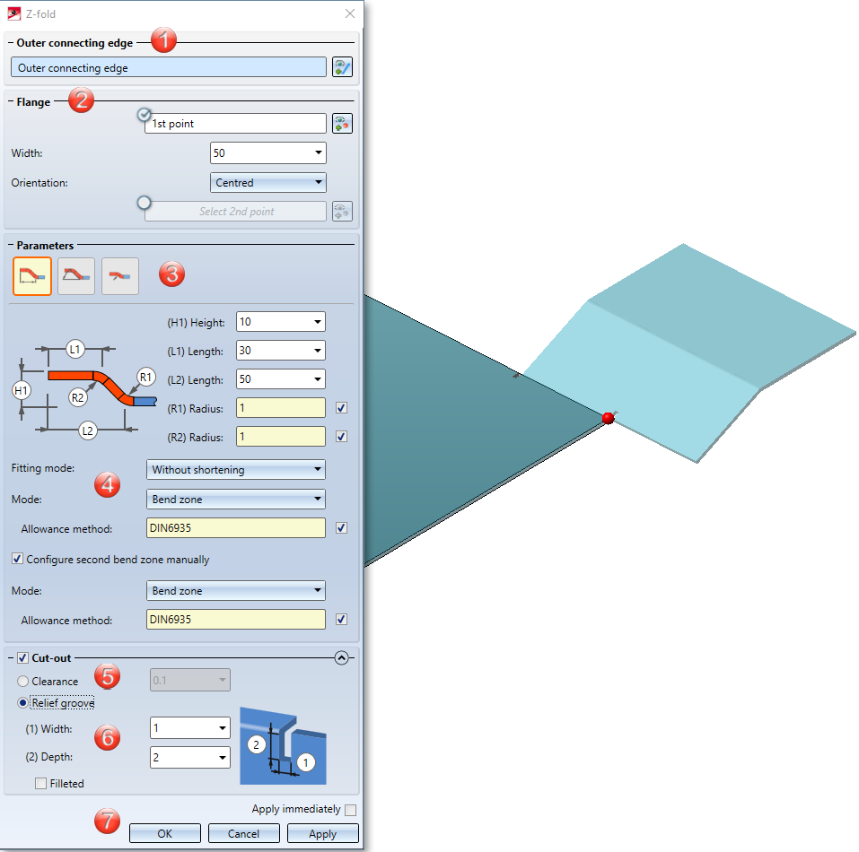 The Z-fold function allows you to attach 2 flanges to a sheet with one single working step. As soon as your inputs are sufficient, a preview of the new flanges will be displayed. That is, if you choose a connecting edge, the possible Z-fold with the standard values will be displayed. If you have activated Width via point(s), the new flanges will only be shown after identifying a point and the width, or 2 points, provided that you have chosen the connecting edge. Furthermore, you will directly seethe change if, for instance, you switch from Shorten, outer to Shorten, inner. If the Apply immediately checkbox has been activated, the Z-fold will be immediately attached if the value inputs are sufficient and make sense, and can then be changed via the Feature log.