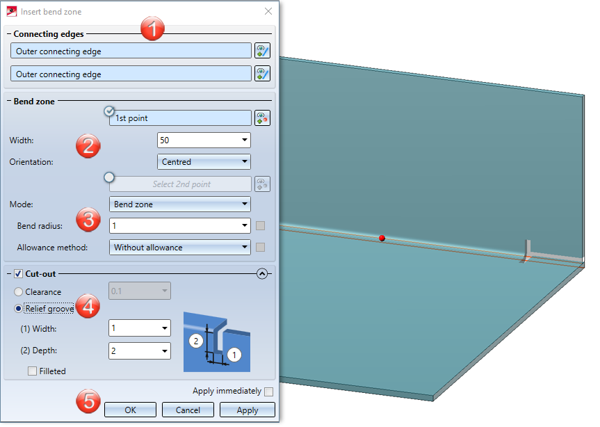 Once you have entered all the necessary data, the new bend zone can be installed. If you select Apply or press the middle mouse button (MMT), the bend zone will be inserted, but the dialogue window remains open- in contrast to OK. This also allows you to change the data and assign it to another sheet metal part using Apply. If you close the dialogue window with Cancel, the function will be aborted without any insertion or modification taking place. If you have activated the