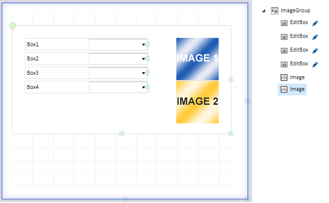 After inserting ImageGroup, there will initially only be an empty frame, which you can then fill with further GUI objects. When objects are dragged into the ImageGroup, they will be aligned in tabular form. The assigned objects are regarded as sub-objects of the ImageGroup.