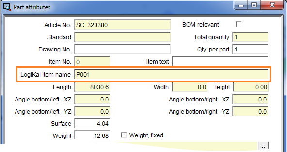 For beams, profiles and glass panes that have been imported from the LogiKal item database to HiCAD, the LogiKal item name will be shown as a HiCAD part attribute in the in the Part attributes dialogue window.
