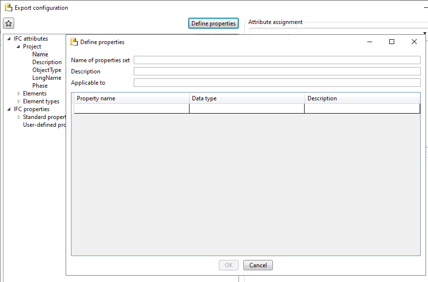 Use the Define properties button to create user-defined PropertySets, in addition to the standard PropertySets of the IFC format.