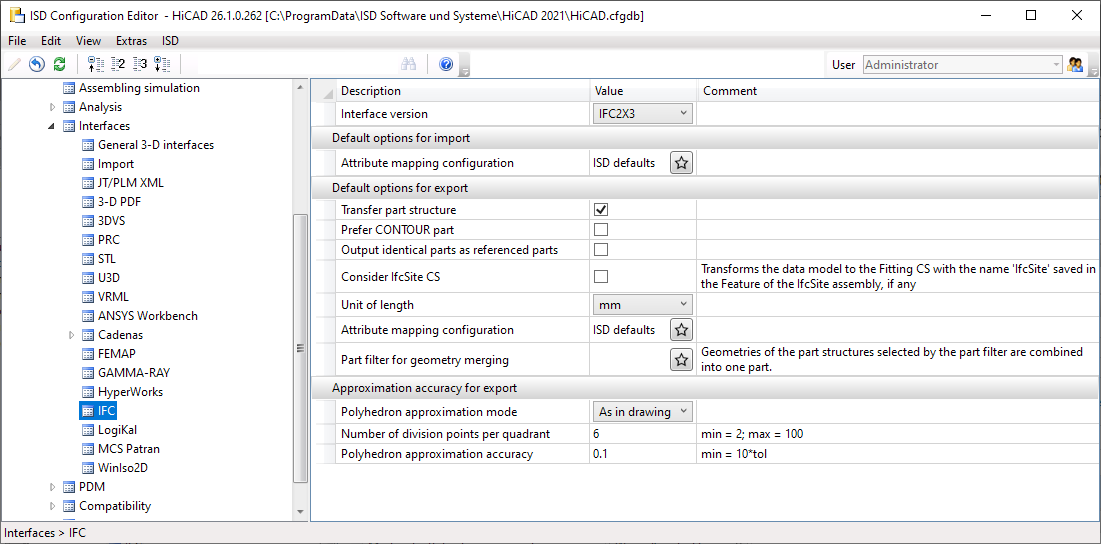 In the Configuration Editor you can, besides the default settings of the Export options (Prefer CONTOUR part and Unit of length), also define the corresponding attribute mapping configuration for Import and Export.