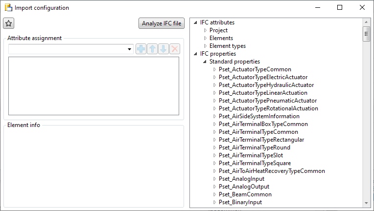 Use the Analyze IFC file button to select an existing IFC file which will then be analyzed. Your individual PropertySet definitions will be additionally loaded into the tree of IFC attributes that can be mapped with appropriate HiCAD attributes on the left hand side.