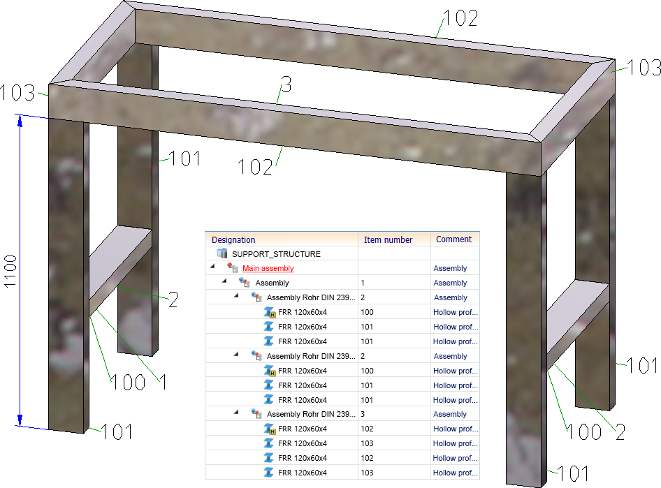 The drawing shown consists of several hollow profiles FRR 120x60x4. The profiles with the item number 101 have a length of 1100 mm and are to be ordered with a fixed length, i.e. the attribute Fixed length must be assigned to these profiles. All other profiles are to be cut from the standard length of 6000 mm.
