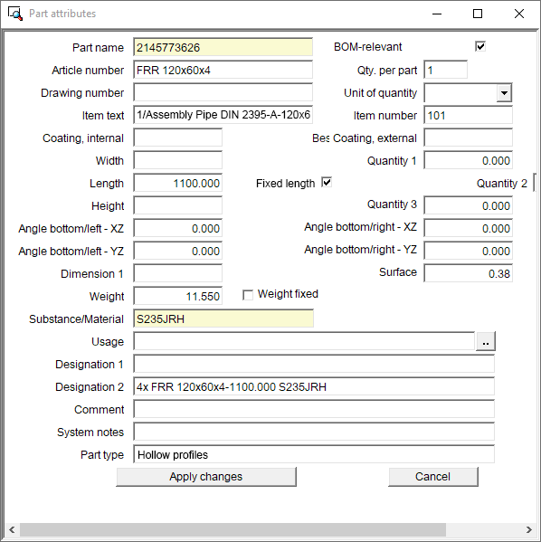 After a restart of HiCAD the extended attribute mask is available, so that now the attribute Fixed length can be assigned to the profiles with the item number 101 by activating the corresponding checkbox.