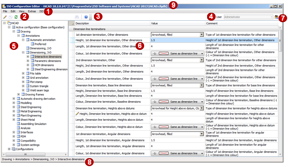 Changes in the Configuration Editor will only take effect after you re-start HiCAD. Only some particular settings, such as dimensioning pre-settings, can be applied, via the corresponding HiCAD functions, without a re-start.