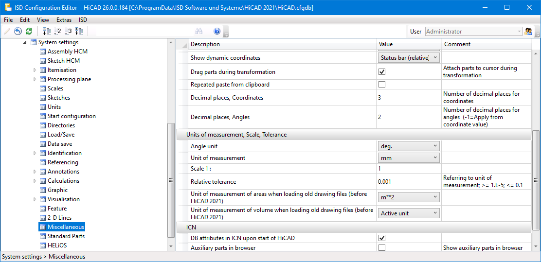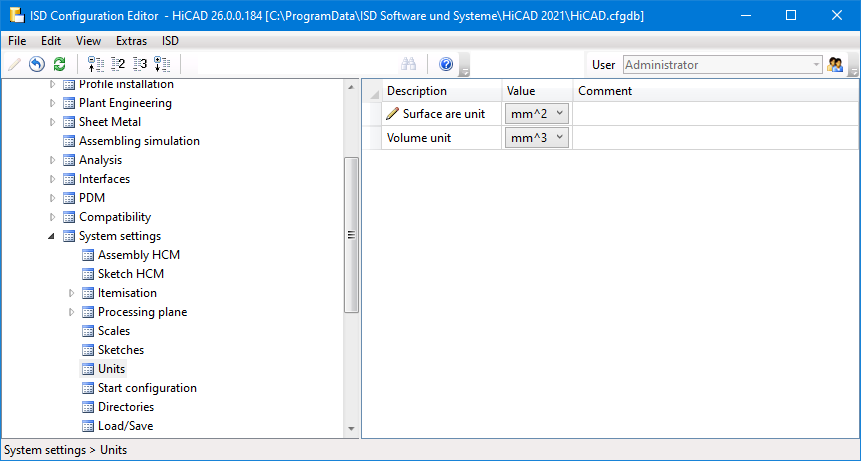 In addition to the unit of measurement of the model drawing, you can specify for the surfaces (attribute §10) and volumes (attribute §20) in which unit of measurement they are to be output in the ICN, in the attribute masks, in the HiCAD Viewer, in parts lists and when transferred to HELiOS. As of HiCAD 2021, you define this in the Configuration Editor at System settings > Units. The ISD default setting for surfaces is square metre m2, for volumes cubic millimetre mm3.