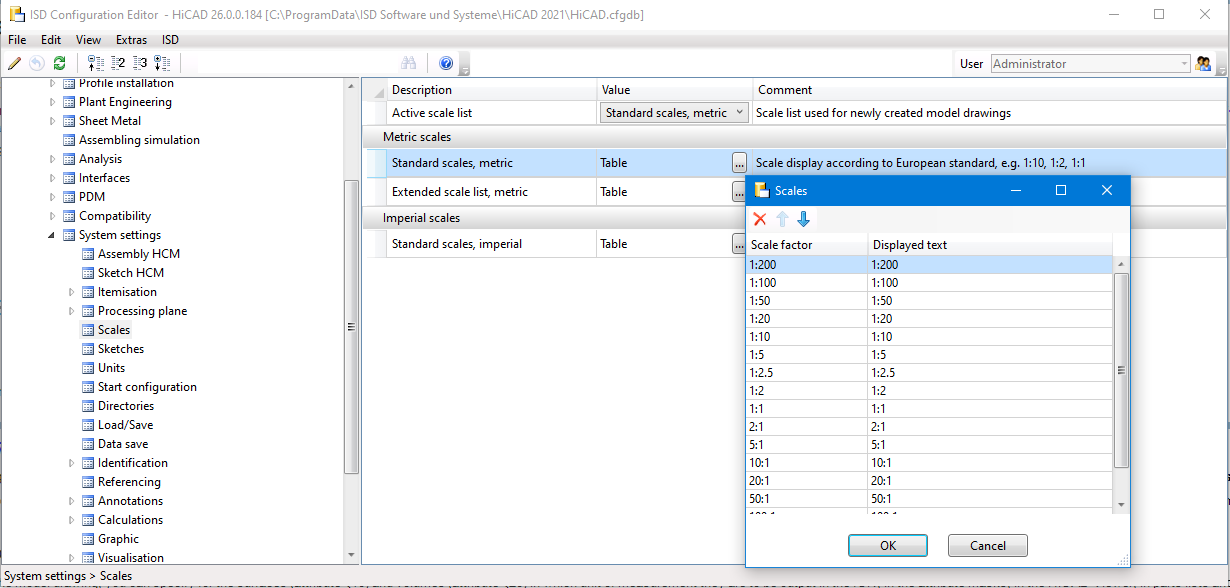 The predefined scale lists can be edited and additional scale lists can be defined. To find out how to do this, read the Definition of Scales topic in the HiCAD Basics Help.