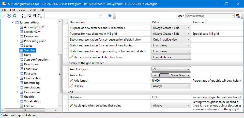 The display of the grid reference when creating planar sketches and 3-D sketches with the sketching tool can be set in the Configuration Editor at System settings > Sketches and there in the section Display of grid reference.