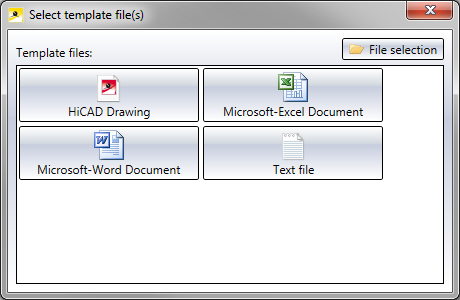 Select one of the initialised template files for the desired document (HiCAD, Word, Excel or Text), or click File selectionto select a particular file from your local system.