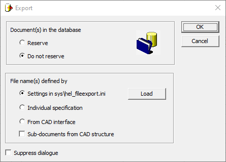 If the Suppress dialogue checkbox at the bottom of the window is activated, all export operations under the logged in user will be performed in the future with the last set options. The dialogue for saving the file opens directly, i.e. without the previous dialogue for the export options.