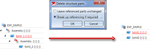 - If parts that are not to be deleted are located beneath solids, they will be moved to the uppermost level of the part structure.