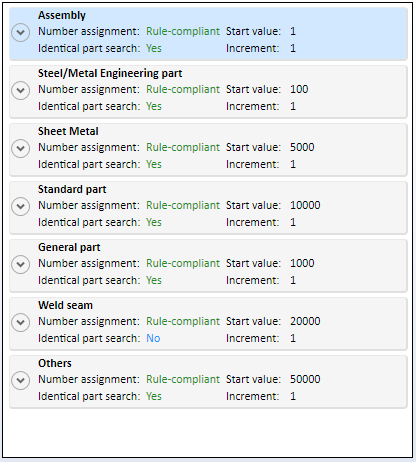 If this parameter is set to Yes, identical parts of the parts group will be detected automatically according to the specified search criteria on the General tab. Identical parts will then obtain the same item number.