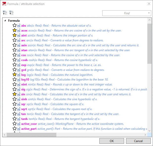 A function/attribute is selected by double-clicking on its name in the selection list. The function is entered in the editor's input field and you can add the desired argument (in brackets) and extend the formula as desired. Nested formulas are also possible.