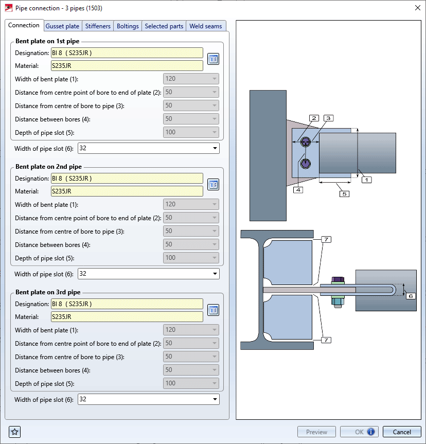 Click the Preview button if you want to display a preview of the connection based on the currently entered data. If you want to modify the current data, apply the required changes and click Preview again to update the preview. Click OK to insert the connection according to the current data and close the dialogue window. If you click the Cancel button, the window will be closed, and the specified or changed connection will not be inserted.
