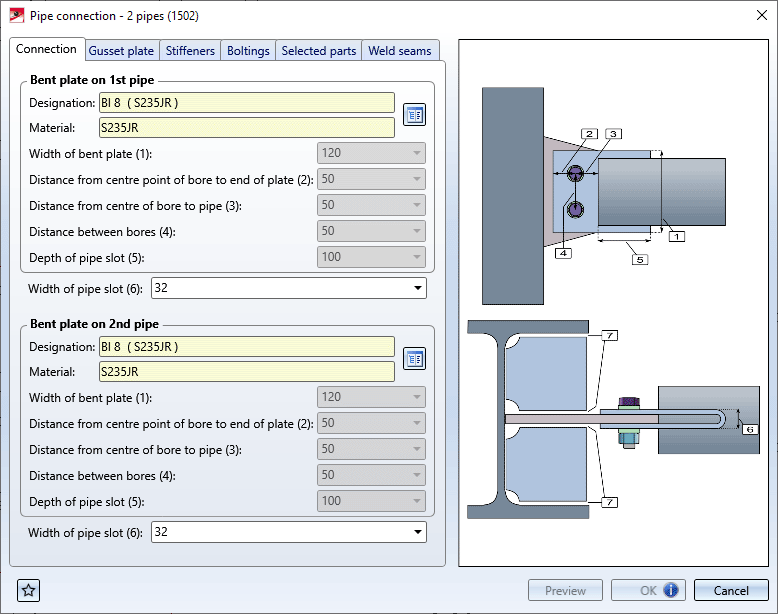 Click the Preview button if you want to display a preview of the connection based on the currently entered data. If you want to modify the current data, apply the required changes and click Preview again to update the preview. Click OK to insert the connection according to the current data and close the dialogue window. If you click the Cancel button, the window will be closed, and the specified or changed connection will not be inserted.
