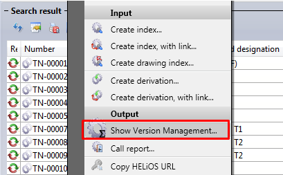 On the Input/Output tab of an Article or Document detail mask, or with a right-click on empty space in an Article detail mask, or with a right-click on an object in a result list you can call the Show Version Management function.