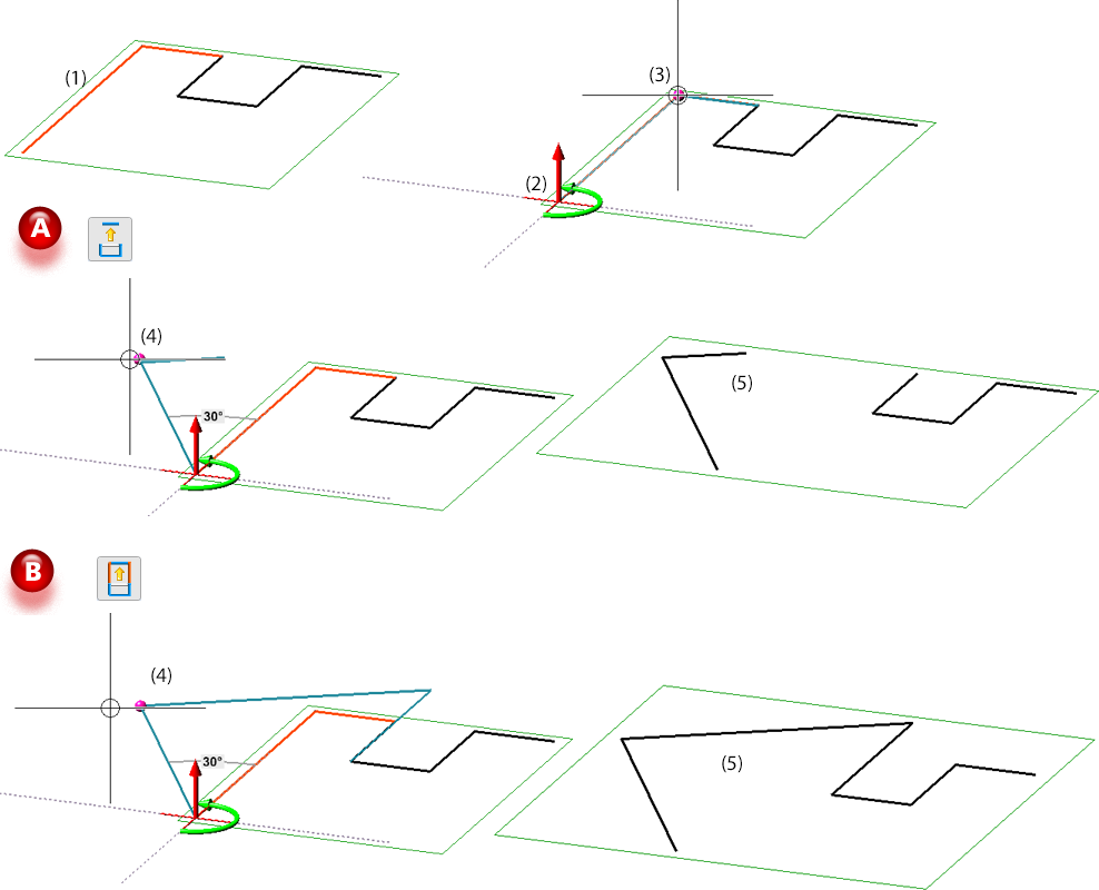 This function does not determine the rotation angle to the X-axis, but to a line between the rotation point and a second point. The lines between the rotation point and this point will be rasterized and the angle can then be determined dynamically with the cursor. Example: (A) The two lines marked in red (1) are to be rotated. The lower left point is selected as the rotation point. The angle refers to the X-axis. (B) Here, after determining the rotation point, the Angle reference function is called and the upper right point is selected. Now the angle refers to the line between the rotation point and the upper right point.