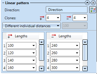 Like Total distance, but with the difference that the distance will be calculated automatically according to the selected direction vector. If you have chosen a coordinate axis as direction vector, the distance will be automatically set to 1. - Different individual distances