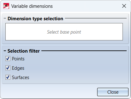 1. HiCAD will then prompt you to specify the base point. You can do this by selecting a point, an edge or a surface. In the Selection filter section specify which elements - points, edges or surfaces - you want to allow for selection by activating/deactivating the checkboxes.