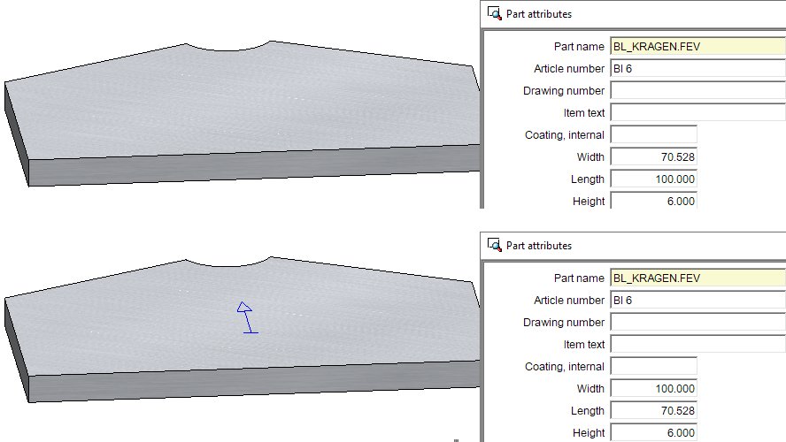 The processing direction is also taken into account when calculating dimensions and aligning parts.