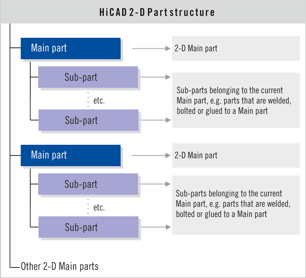 A HiCAD Drawing basically consists of 2-D and 3-D parts, which can be single Parts, or Assemblies. In HiCAD one distinguishes between Main parts and Sub-parts. This provides the basis for a reasonable Part structure.