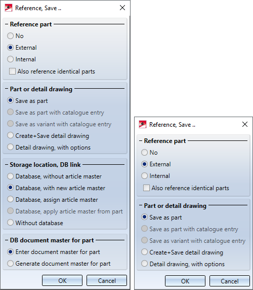 If this option is active and the active part is no referenced part, the options Extenal referencing and Internal referencing will be greyed out. To save an externally referenced part to a catalogue, save it as a referenced part beforehand ( External referencing, Save as part). After this, call the Reference part, Save, Detail drawing function for this part again and select the option Save as part with catalogue entry.