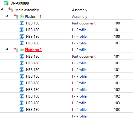 In the parts structure you can see that the beam with the item number 101 appears several times in both construction sections.