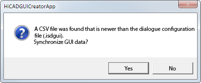 - If a user dialogue is opened in the HiCAD Dialogue Editor and HiCAD detects that the corresponding CSV file is newer, a corresponding message appears: