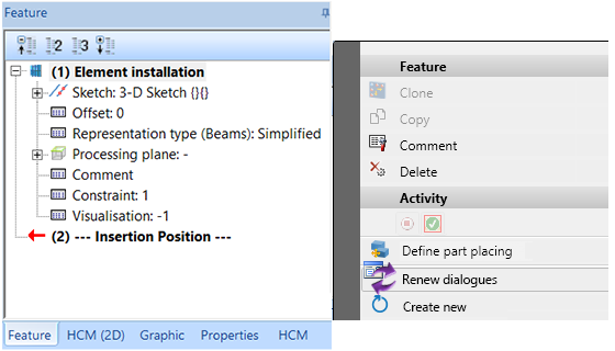 - HiCAD automatically determines whether the user dialogue of an already installed variant has been changed subsequently. If you then right-click on the feature Element installation created in a corresponding element installation, the Renew dialogues function is available in the context menu. With this function you can update the user dialogue displayed when editing the element installation.