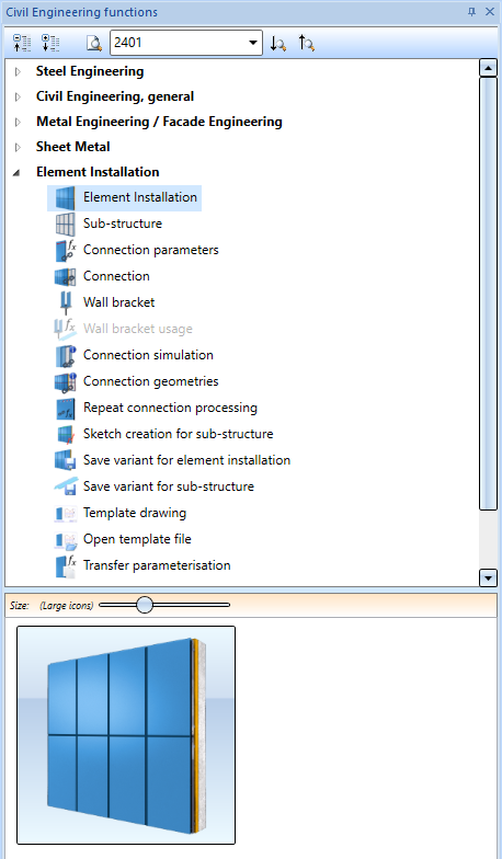 You find the Element installation function in the Civil Engineering functions docking window beneath Element installation. If the docking window is not visible, activate it by choosing