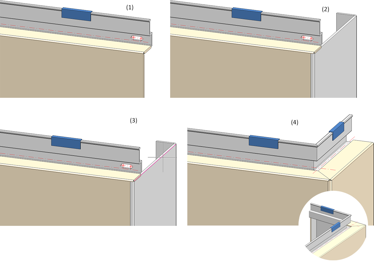 (1) Element installation without flanges; (2) Attached flange with 35mm lateral flange; (3) Calling of Design Variant and selection of marked edge; (4) Result