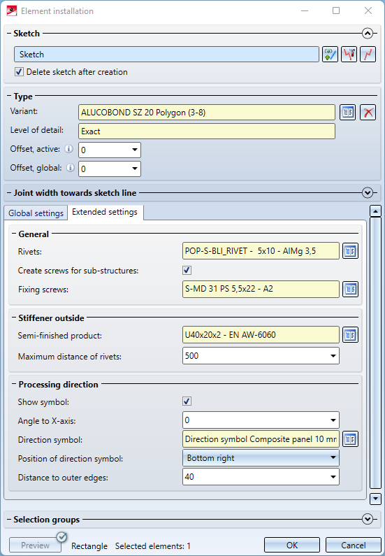 On this tab you select the desired semi-finished product and the parameter for the individual configuration of the edges. You can decide yourself whether standard parts are to be installed for fastening or not. The default setting is that standard parts are created, i.e. the checkbox is deactivated. If the checkbox is deactivated , the standard parts are not listed in the bill of materials.