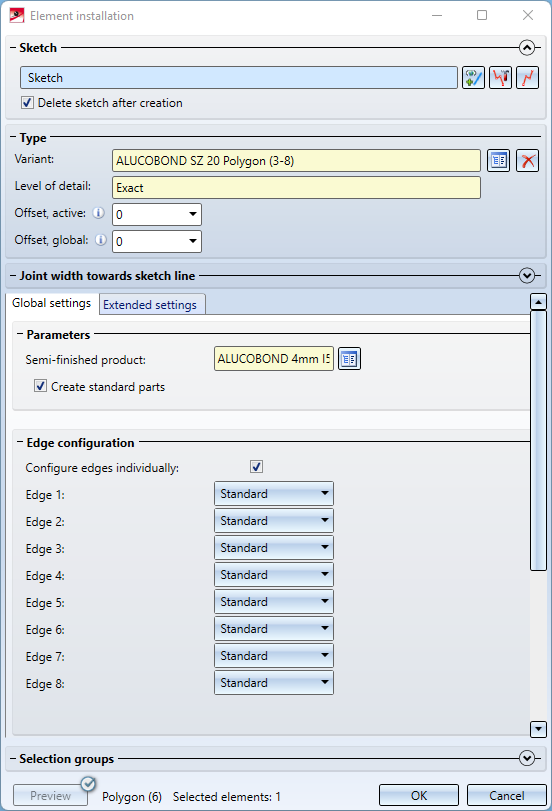 If you want to configure the edge processing individually, activate the corresponding checkbox. You then have the option of specifying for each edge of the polygon what is to be created at the edge.
