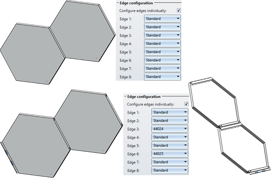 - If you have selected the Stiffener profile option for the Edge configuration on the Global settings tab, then the profile type selected here and the maximum distance of the rivet are used..