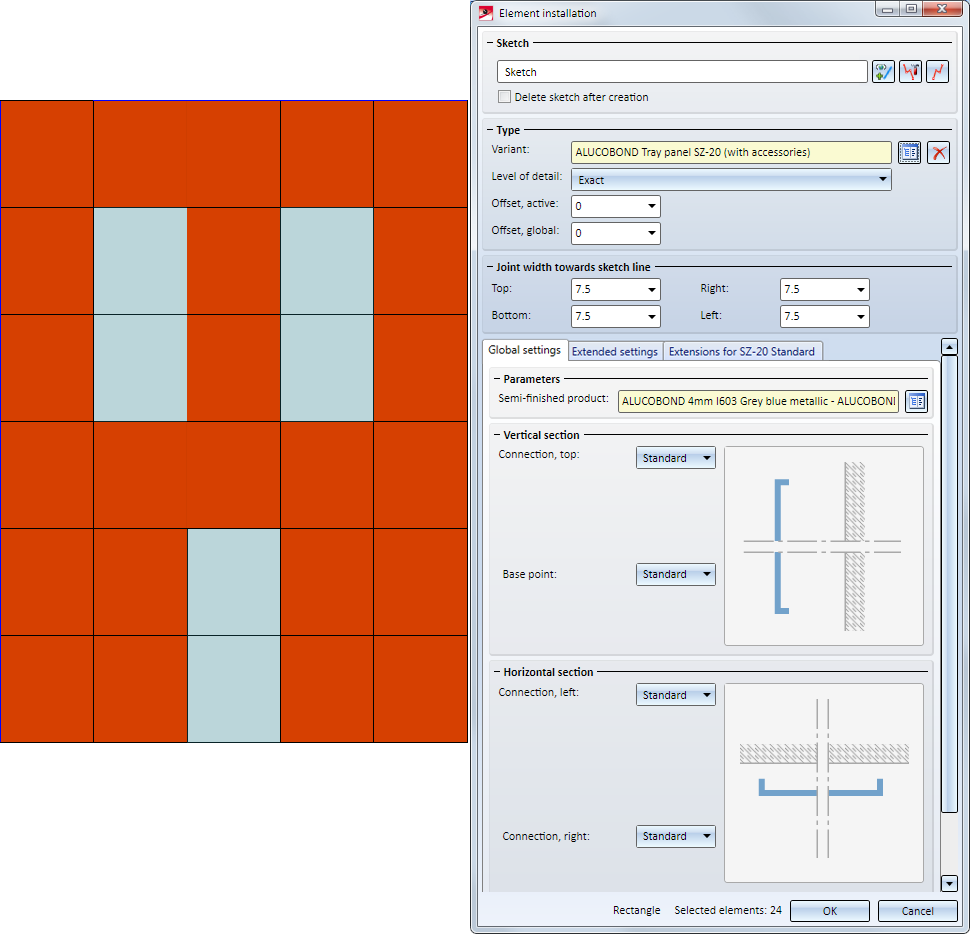 In the example below, ALUCOBOND® tray panels SZ-20 are to be placed on the shown sketch.