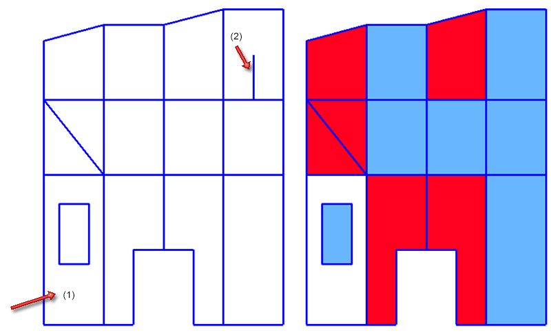 In the sketch shown below, for instance, you can place "rectangular" installation elements on the blue areas, and polygonal installation elements on the red areas. Area (1) and the lines (2) will be ignored.